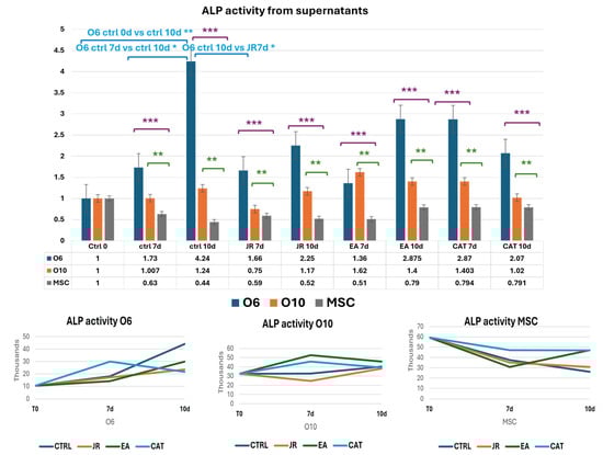 Graphics of induced alkaline phosphatase activity represented as fold-change versus control from supernatants of MSC, O6 and O10 cell cultures in osteogenic medium and after 3 treatments of JR, EA and CAT; samples were collected at time 0, 7 and 10 days. Error bars represent the standard deviations of three measurements (n = 3). Statistical analysis representation: One-way ANOVA (Kruskal–Wallis test followed by Dunn’s Multiple Comparison Test) results are illustrated with comparison of cell groups: O6 vs. MSCs (purple brackets and stars *** p < 0.001); O10 vs. MSCs (green brackets and stars ** p < 0.01). Two-way ANOVA analysis is represented with blue brackets and stars * p < 0.05).