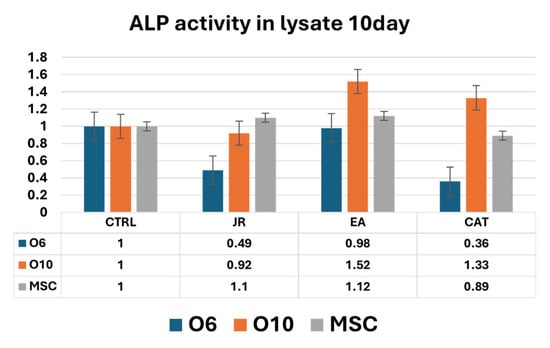 A graphic representation of alkaline phosphatase activity (as fold-change versus control) measured from cell lysate samples of MSC, O6 and O10 cell cultures in osteogenic medium and after 3 treatments of JR, EA and CAT; samples were collected at 10 days. Error bars represent the standard deviations of three measurements (n = 3).