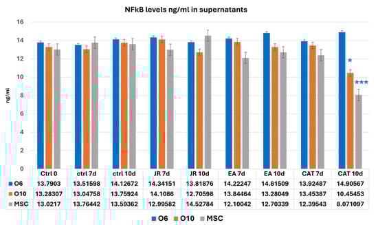 NF-kB values showed variations without significant differences in almost all the samples analyzed. CAT, through its cytotoxic action, reduced the number of cells to much lower values at 10 days for MSCs and O10 cells. Statistical differences in NF-kB (two-way ANOVA followed by Bonferroni posttest) were only registered for CAT at 10 days of cultivation compared to the control samples (Figure 17).