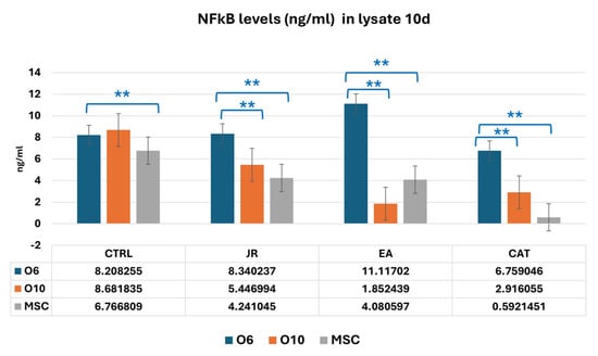 A graphic representation of NF-kB values (ng mL−1) evaluated from cell lysate samples of MSC, O6 and O10 cell cultures in osteogenic medium and after 3 treatments of JR, EA and CAT; samples were collected at 10 days. Error bars represent the standard deviations of three measurements (n = 3). One-way ANOVA followed by the Bonferroni post test for evaluation of significant differences between cell lines in response to JR, EA and CAT treatments. The p-values is set as ** p < 0.05.