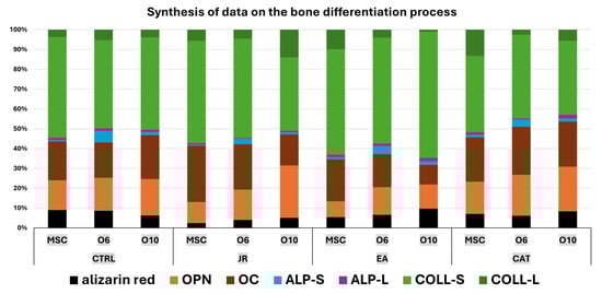 A schematic diagram of the majority of the main elements of bone differentiation with a synthesis of quantifiable results reflecting the response of MSCs and osteoblasts to treatments with JR, EA and CAT (OPN—osteopontin, OC—osteocalcin, ALP-S—alkaline phosphatase in supernatants, ALP-L—alkaline phosphatase in cell lysates, COLL-S—collagen levels in supernatants, COLL-l-—collagen levels in cell lysates).