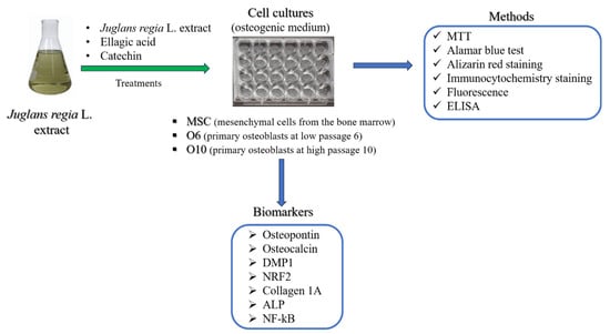 Plant extracts obtained from Eucommiae cortex, Salvia miltiorrhiza and Curcuma longa have been successfully applied in the treatment of fractures because of their strong anti-inflammatory effects. These properties are not due to a single component, but rather a complex mixture of bioactive compounds with synergistic action on the bone microstructure [2]. QEP, a traditional Chinese medicine formula composed of E. ulmoides Oliv., P. corylifolia L., A. sativum L. and J. regia L., has shown beneficial effects on osteoporosis in ovariectomized rats and in vitro on human osteoblastic cell cultures hFOB 1.19. Alizarin red quantification also showed mineralization of hFOB 1.19 cells, and ALP determination supported osteogenic differentiation [46]. Pang et al. promoted osteoblast differentiation of human bone marrow-derived mesenchymal stromal cells (hBMSCs) by using JR leaf extract, indicating improved expression of pro-osteogenic biomarkers such as ALP, OCN or OPG. However, the extract did not present a significant effect on cell proliferation, while ALP determination revealed that walnut leaf extract improved osteogenic activity depending on the dose [24].