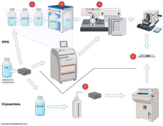 Schematic representation summarizing processing steps for standard formalin-fixed paraffin-embedded (FFPE) and frozen samples sectioning, highlighting steps where some scaffold-specific modifications usually should be applied (exclamation marks). EtOH, ethanol; Par, paraffin; PFA, paraformaldehyde; Xyl, xylene.