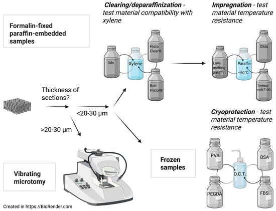 Standard paraffin embedding, with no modifications reported, was applied for some scaffold constructs, such as silk fibroin (SF) [49], SF-hydroxyapatite [50], PCL [51] and poly (2-hydroxyethyl methacrylate) [52]. For others, only minor adaptations were applied, as for commercially available polystyrene scaffold Alvetex® (Reinnervate Limited, Sedgefield, UK), where only HistoClear® (National Diagnostics, Atlanta, GA, USA) was used instead of xylene [53]. However, some steps of complex FFPE samples processing are not compatible with some of the scaffold materials (Figure 1).