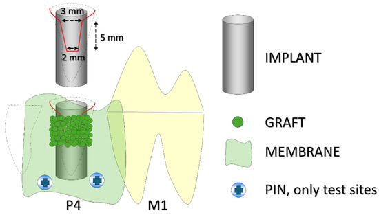 A schematic illustration of the experimental design. The black dashed lines indicate the profile of the alveoli, while the red line outlines the buccal defect. P4 refers to the fourth premolar and M1 to the first molar. The implant was placed in the distal alveolus of P4. Pins were used only at the test sites.