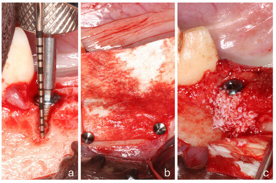 All surgical procedures were performed by an experienced oral surgeon (T.I.). A full-thickness mucoperiosteal flap was raised, and the fourth premolars were extracted bilaterally. Implants (3.5/10 mm; I-ON Implant Conical Platform; AB Dental Devices Ltd., Ashdod, Israel) were placed in the distal sockets of both sites, with the implant shoulder positioned at the level of the buccal bony crest. A cover screw was attached to each implant. Standardized buccal bony defects were prepared on both sides, measuring 5 mm in height, with an approximate width of 3 mm coronally and 2 mm apically (Figure 2a). A pericardium membrane (Heart Bioteck® S.p.A., Arcugnano, Vicenza, Italy) was placed in both groups. However, apical stabilization using titanium pins (Titan Pin Set; Botiss biomaterials GmbH, Zossen, Germany) was performed only at the test sites (Pin group; Figure 2b), while no pins were applied at the control sites (No-pin group). At the test sites, small holes were first prepared in the apical region using a round bur. The pins were then positioned with a dedicated pin holder and inserted into the prepared holes while simultaneously securing the membrane. Final fixation was achieved by gently tapping the pins into place using a surgical mallet.