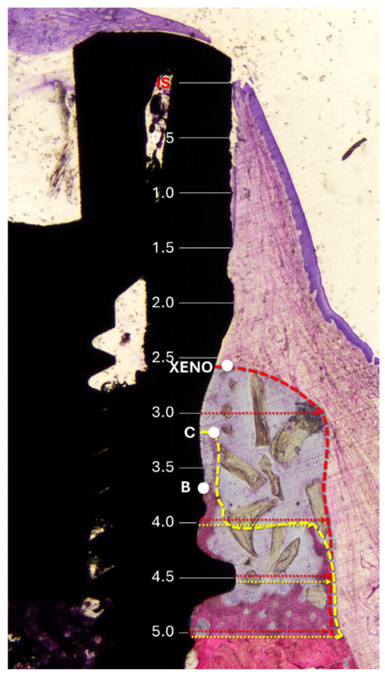 Histological references and measurements. IS, implant shoulder; C, top of the bone crest at the lingual aspect; B, coronal level of osseointegration. Distances from the implant surface to the most lateral extension of the bone (yellow arrows) and xenograft (red arrows) were measured at 0.5 mm intervals from IS to 5 mm apical to IS. Dashed lines delineate the periphery of the bone (yellow) and the xenograft (red). The region of interest is marked with a translucent overlay to allow for clear visualization of the underlying histological structures.