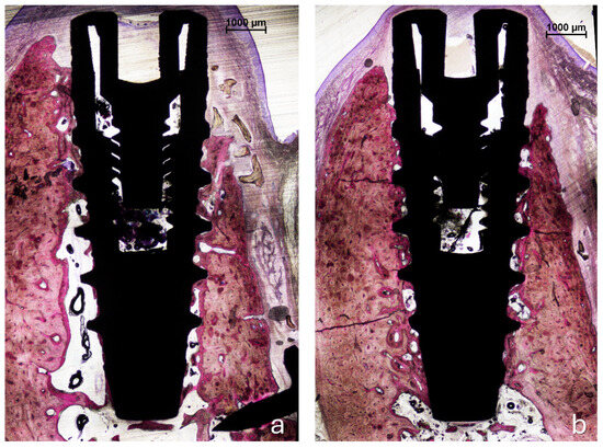 Following fixation, the samples underwent histological processing using the Precise 1 Automated System (Assing, Rome, Italy). Dehydration was performed through an ascending series of alcohols, following which the specimens were embedded in Technovit 7200 VLC (Kulzer, Wehrheim, Germany), a glycol methacrylate resin. Once polymerized, the blocks were sectioned longitudinally in the buccolingual plane using a high-precision diamond saw to a thickness of approximately 150 µm, then thinned to ~30 µm using a grinding unit. Sections aligned with the implant’s central axis were stained with acid fuchsin and toluidine blue. Orientation was verified based on anatomical landmarks and the implant-healing cap junction to ensure consistent identification across all samples.