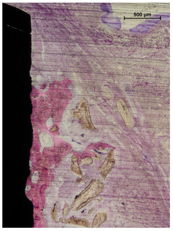 A photomicrograph of a ground section. In some cases, bone regeneration extended up to areas near the implant shoulder. Beyond the regenerated bone, residual graft granules were observed to be embedded within connective tissue. Acid fuchsin and toluidine blue stain. The bar scale is included in the image.