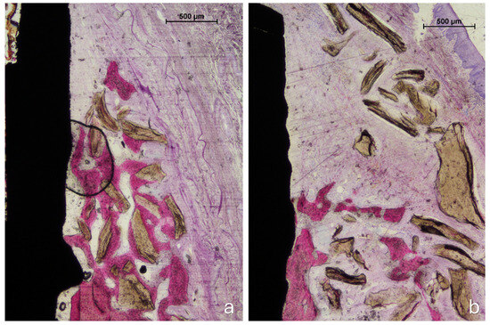 All histological sections were successfully collected, resulting in a complete dataset (n = 6). In the no-pin group, one implant exhibited mucosal perforation; however, no associated inflammatory cell infiltration was observed. Bone regeneration was evident in all samples in both groups (Figure 4a,b). The amount of residual xenograft appeared greater in the pin group, while several specimens in the no-pin group showed minimal or no remaining granules. When present, the graft particles were traversed by newly formed bone, occasionally reaching the coronal edge of the augmented region (Figure 4b and Figure 5).