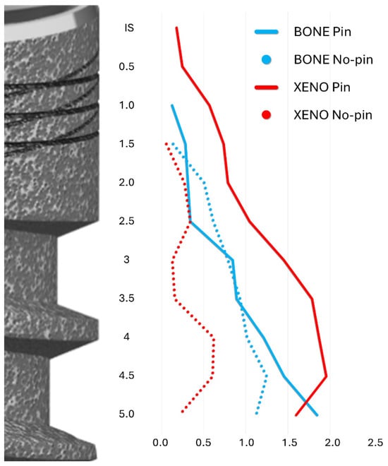 A graph illustrating the lateral extension at both the pin and no-pin sites of the bone and xenograft (Xeno) from the implant surface taken at 0.5 mm intervals from the IS to 5 mm apical to the IS. Blue lines: Bone; Red lines: Xenograft. Plain lines: Pin group; dotted lines: No-pin group.