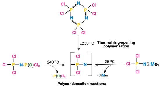 Thermal ring-opening polymerization (TROP) is the traditional route to synthesize linear PPZs from the cyclic tetramer polyphosphazenes. Hexachlorocyclotriphosphazene (HCCP) is the most used precursor to produce PDCP following this method. Alternatively, similar cyclophosphazenes bearing bromo or fluor groups can also be used. However, their use is less extended as they require more extreme conditions to open their ring [7,33]. HCCP is converted to PDCP through several steps, but the mechanism of the reaction is still unclear. It is known that the reaction can be performed in molten or solution state, and critical factors for success are high purity of the starting materials, elevated temperatures, and an inert atmosphere. Absolute control of reaction conditions is mandatory; otherwise, the byproduct cross-links and precipitates [34].