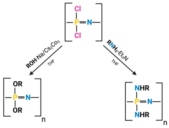 Representative scheme of PDCP macro-substitution in which the chlorine atoms attached to phosphorus are replaced by organic chains ending in hydroxyl groups (reaction represented by the left arrow) or by amino groups (reaction represented by the right arrow). Created in BioRender. Garcia-Fuentes, M. (2025) https://BioRender.com/x57j2mo (accessed on 29 July 2025).