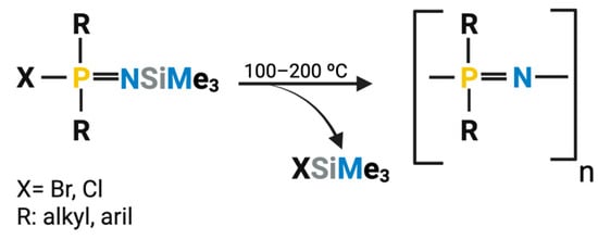 One-step synthesis is advantageous when producing polymers that are difficult to obtain through other methods. These include polymers with methyl, ethyl, or phenyl side groups directly linked to the polymer’s skeleton through phosphorus–carbon bonds. There are also limitations to the side groups that can participate in this polymerization; notably, those reagents should not contain functional groups that may interact with the reactive Si-N or P-O bonds from the phosphoranimine precursor [52].