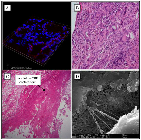 Microphotographs of implanted scaffolds. (A) 3D organization of endothelial cells with confocal microscope (Nikon a1—width 212.13 µm, height 212.13 µm, depth 11.63 µm—cellular nucleus in blue, antibodies anti-CD31 in red); (B) Gallbladder-jejunal scaffold histological examination (EE20×) shows intense chronic inflammatory infiltration in the portion of the scaffold; (C) CBD tubular scaffold histological examination shows the contact point of proximal anastomosis (EE5×); (D) the scaffold patch of CBD is partially degraded at electron microscopy 5000×. Sources: (A,C,D) are reprinted from Ref. [38]; (B) = owned by the co-authors.