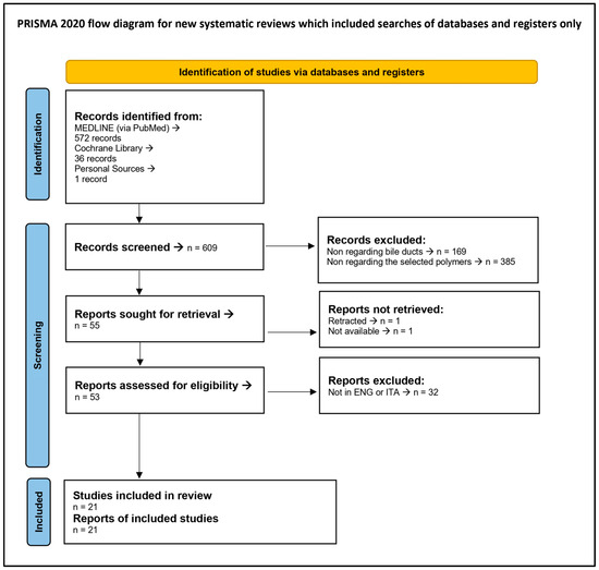 - PubMed String → ((“Bile Ducts”[Mesh] OR “Biliary Tract”[Mesh] OR “Common Bile Duct” OR “CBD” OR “CBD injuries” OR “CBD repair” OR “Biliary injury repair” OR “Bile duct regeneration” OR “Biliary reconstruction”) AND (“Polymeric scaffold” OR “Bioabsorbable polymer” OR “Biodegradable scaffold” OR “Polycaprolactone” OR “PCL” OR “Polyhydroxyethyl aspartamide” OR “PHEA” OR “Polylactic Acid” OR “PLA” OR “Polylactide” OR “Tissue Engineering” OR “Regenerative Medicine”)).Used filters → Published in the last 20 years.Number of Results → 572.