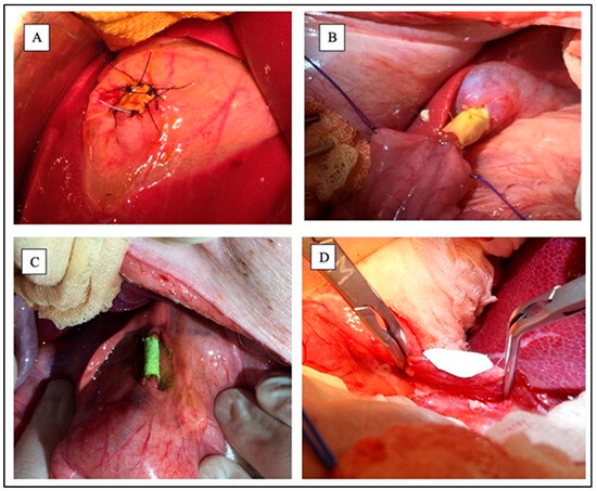 Figure 3. Experimental groups during surgeries. (A) Gallbladder wall planar scaffold; (B) Gallbladder-jejunal scaffold; (C) Common Bile Duct tubular scaffold; (D) Common Bile Duct patch during suturing. Sources: (A–C) are reprinted from Ref. [38]; (D) = owned by the co-authors. - Group B: Gallbladder-jejunal tubular scaffoldThe gallbladder was isolated and a jejunal loop was mobilized. Both the gallbladder-scaffold and the scaffold-jejunal anastomoses were obtained by continuous suture with absorbing monofilament (Figure 3B).