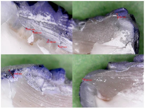 Although microleakage values were ultimately reported in millimeters, measurements were performed using calibrated digital imaging software (AmScope v4.11), with precision up to three decimal places (0.001 mm). This allowed detection of subtle differences in dye penetration, enhancing the sensitivity of the analysis despite rounding values for reporting clarity. All values were recorded to the nearest 0.001 mm and only rounded during final data presentation.