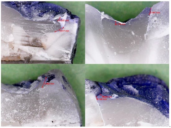 The maximum depth of dye penetration (in mm) was measured from the external enamel margin toward the pulpal floor using calibrated imaging software (AmScope Measurement Software, v4.11). Only linear dye progression at the interface was recorded. Internal staining or dye diffusion not originating from the margin was excluded.