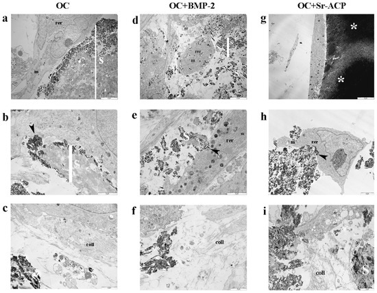 Morphology and matrix secretion of NHOsts grown on different OC scaffolds. Representative TEM images of NHOst/scaffold interaction and ECM deposition after 14 days of culture. rer: rough endoplasmic reticulum; m: mitochondria; coll: collagen fibrils; black arrowhead: focal contact; S: scaffold; white asterisk: ACP granule. (a,d,g) Scale bar: 5 μm; (b,c,e,f,h,i) scale bar: 2 μm.