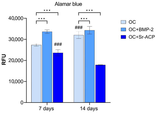 Cell proliferation of NHOsts grown on OC, OC+BMP-2, and OC+Sr-ACP scaffolds. The results were evaluated by Alamar Blue assay after 7 and 14 days of culture and expressed as relative fluorescent units (RFUs). Comparisons: *** p < 0.001 vs. OC; ### p < 0.001 vs. day 7. Mean ± SD; n = 5 independent experiments with duplicates.