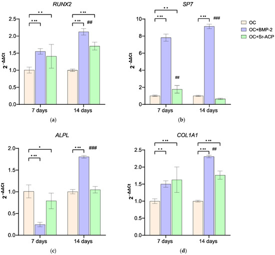 Expression of genes involved in activity of NHOsts cultured on scaffolds. RUNX2 (a), SP7 (b), ALPL (c), and COL1A1 (d) expression levels after 7 and 14 days of culture on OC, OC+BMP-2, and OC+Sr-ACP scaffolds. The results have been normalized to GAPDH and are expressed as fold change relative to the control group (OC), considered as 1. Comparisons: * p < 0.05, ** p < 0.005, and *** p < 0.001 vs. OC at each timepoint. ## p < 0.005; ### p < 0.001 vs. 7 days. Mean ± SD; n = 3 duplicates.