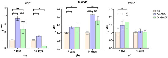 Expression of genes involved in the activity of NHOsts cultured on scaffolds. SPP1 (a), SPARC (b), and BGLAP (c) expression levels after 7 and 14 days of culture on OC, OC+BMP-2, and OC+Sr-ACP scaffolds. The results have been normalized to GAPDH and are expressed as fold change relative to the reference group (OC), considered as 1. Comparisons: * p < 0.05, ** p < 0.005, and *** p < 0.001 vs. OC at each timepoint; # p <0.05, ## p <0.005, ### p < 0.001 vs. 7 days. Mean ± SD; n = 3 duplicates.