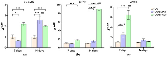 Expression of genes related to osteoclasts. OSCAR (a), CTSK (b), and ACP5 (c) expression levels after 7 and 14 days of co-culture with NHOsts. The results have been normalized to GAPDH and are expressed as fold change relative to the reference group (OC), considered as 1. Comparisons: * p < 0.05, ** p < 0.005, and *** p < 0.001 vs. OC at each timepoint; # p <0.05, ## p <0.005, ### p < 0.001 vs. 7 days. Mean ± SD; n = 3 duplicates.