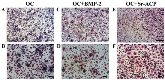 Representative images of differentiating osteoclast cultures stained for TRAP after 14 days of co-culture. Osteoclasts in presence of OC (A,B), OC+BMP-2 (C,D), and OC+Sr-ACP scaffold (E,F). Images at 4× (A,C,E) and 10× magnification (B,D,F). Scale bars: 500 μm (A,C,E) and 100 μm (B,D,F).