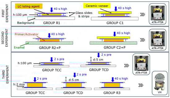 Metallic spacers of 100 μm thickness were used to prepare disc-shaped veneer composite specimens (Ø = 5 mm, n = 5/material), enclosed between microscopic glass slides covered with Mylar strips. The specimens were placed on a white background surface with 80% reflectance and directly irradiated for 40 s with an LED curing unit (Bluephase G4, Ivoclar Vivadent) emitting 1200 mW/cm2 light intensity (“high” irradiation mode), as measured with a curing radiometer (Bluephase 2, Ivoclar Vivadent). This group served as a control (Group R1). Another group (Group C1, cured under ceramic) was prepared by placing over the top Mylar strips of 0.7 mm thick lithium disilicate glass–ceramic specimens (Ø: 6 mm, Emax-Press, shade LT-A2, n = 5/material) and light-cured as previously described (Figure 1, 1st experiment). The total transmittance of the ceramic discs was ≈45% as measured with an integrated sphere (RSA-PE-20, PerkinElmer, Norwalk, CT, USA) attached to a UV–Vis spectrometer (Lambda 35, PerkinElmer). The specimens were stored for 10 min at 37 °C (dark/dry conditions).