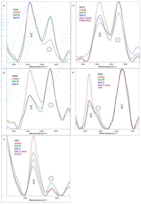 Representative ATR–FTIR spectra with the corresponding analytical and reference bands used for DC% measurements in the first (Section 2.1) and second (Section 2.2) experiments are illustrated in Figure 2. All materials demonstrated well-defined peaks of aliphatic and aromatic vibrations, except for PNV, where a minor aromatic peak appeared in the unset group, which after irradiation became a weak broad shoulder to the main C=C peak at 1638 cm−1. For this reason, the N-H peak at 1535 cm−1 was used as the reference band.