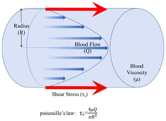 Cross-sectional schematic diagram of a blood vessel illustrating hemodynamic shear stress (τs, shown as red arrows), the frictional force per unit area acting on the inner vessel wall and on the luminal surface of the endothelium as a result of the flow of viscous blood (Q, shown as blue arrows) Based on data from Ref. [26].