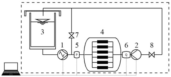 Schematic design of the bioreactor (1: pulsatile pump; 2: static counter pressure pump; 3: reservoir; 4: stented arteries in a culture chamber; 5: pressure transducer; 6: flow rate transducer; 7: bypass valve; 8: counter pressure valve.) [40]. Adapted with permission from Ref. [40]. Copyright 2015 Elsevier.