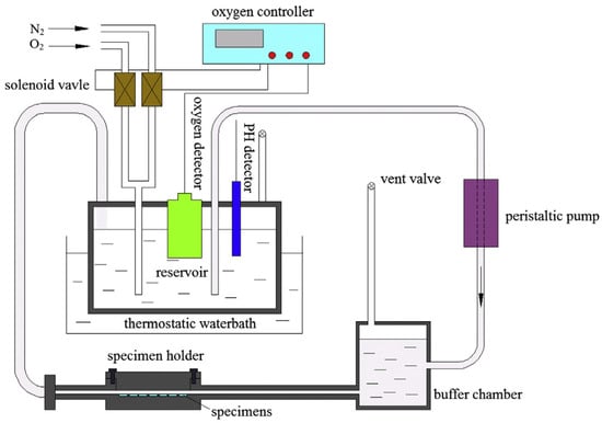 To accurately simulate the physical and chemical environment of the human body, the system employs precise control mechanisms. Temperature is monitored using a detector integrated into the oxygen sensor and regulated by a constant-temperature water bath. Dissolved oxygen concentration is adjusted by introducing oxygen and nitrogen, which are chemically inert in the corrosion reaction, ensuring that the oxygen level remains within physiological conditions. Meanwhile, a buffer solution stabilizes the pH, preventing significant fluctuations during the experiment. The pH of the simulated body fluid is continuously monitored with a pH meter and adjusted as needed by adding diluted sodium hydroxide or hydrochloric acid solutions [52]. This integrated approach to environmental control ensures a controlled experimental environment, improving the reliability and relevance of corrosion assessments.