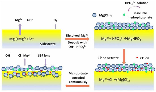 Mg2+ reacts with OH− to form slightly soluble Mg(OH)2, which is deposited on the substrate surface [24]. As corrosion progresses, a protective film, primarily consisting of Mg(OH)2 and MgHPO4, is formed on the material’s surface, as depicted in Figure 6 [25]. The formation of the film has a positive effect on the corrosion performance [86].