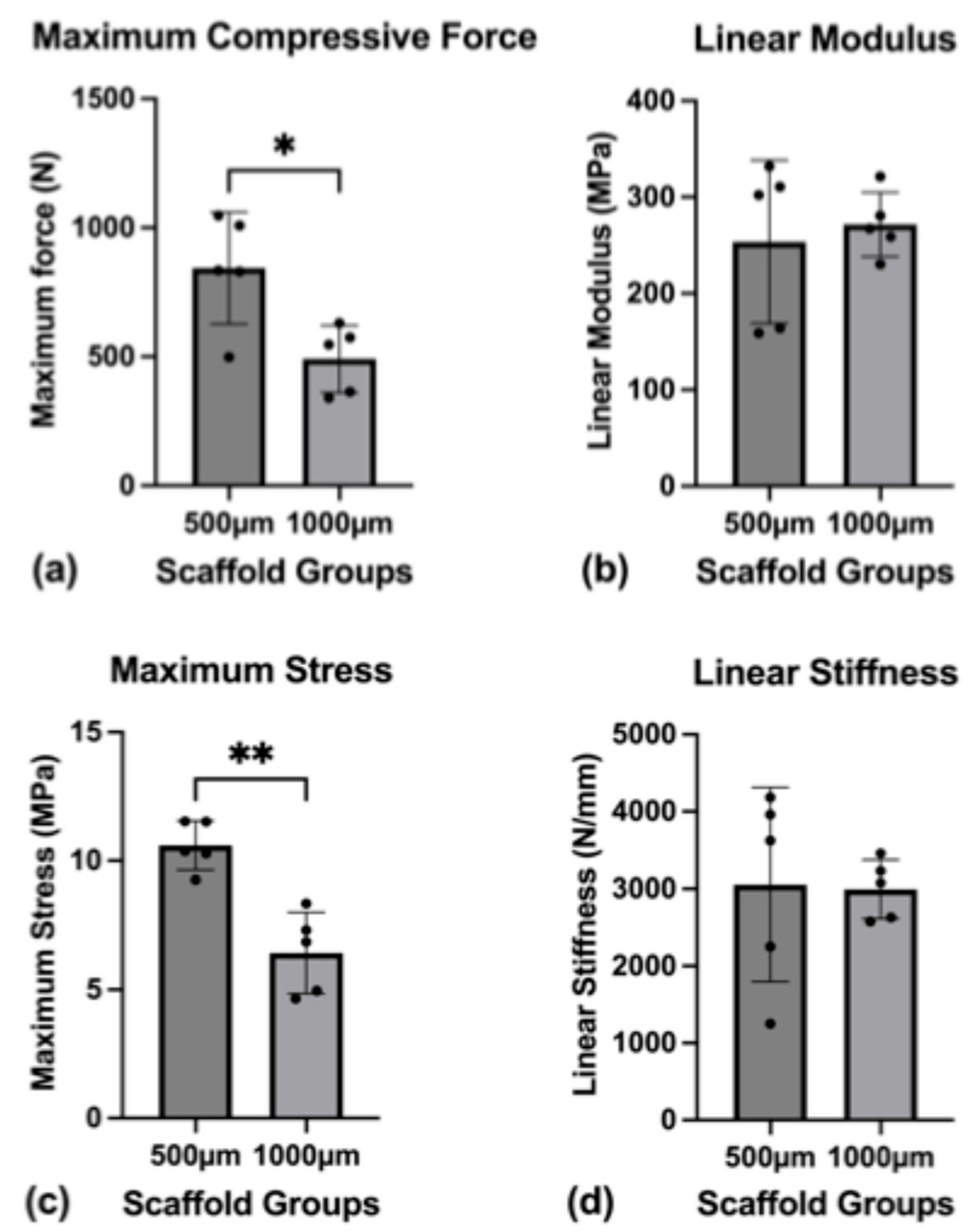 - Wang, M.; Xu, Y.; Cao, L.; Xiong, L.; Shang, D.; Cong, Y.; Zhao, D.; Wei, X.; Li, J.; Fu, D.; et al. Mechanical and Biological Properties of 3D Printed Bone Tissue Engineering Scaffolds. Front. Bioeng. Biotechnol. 2025, 13, 1545693. [Google Scholar] [CrossRef]