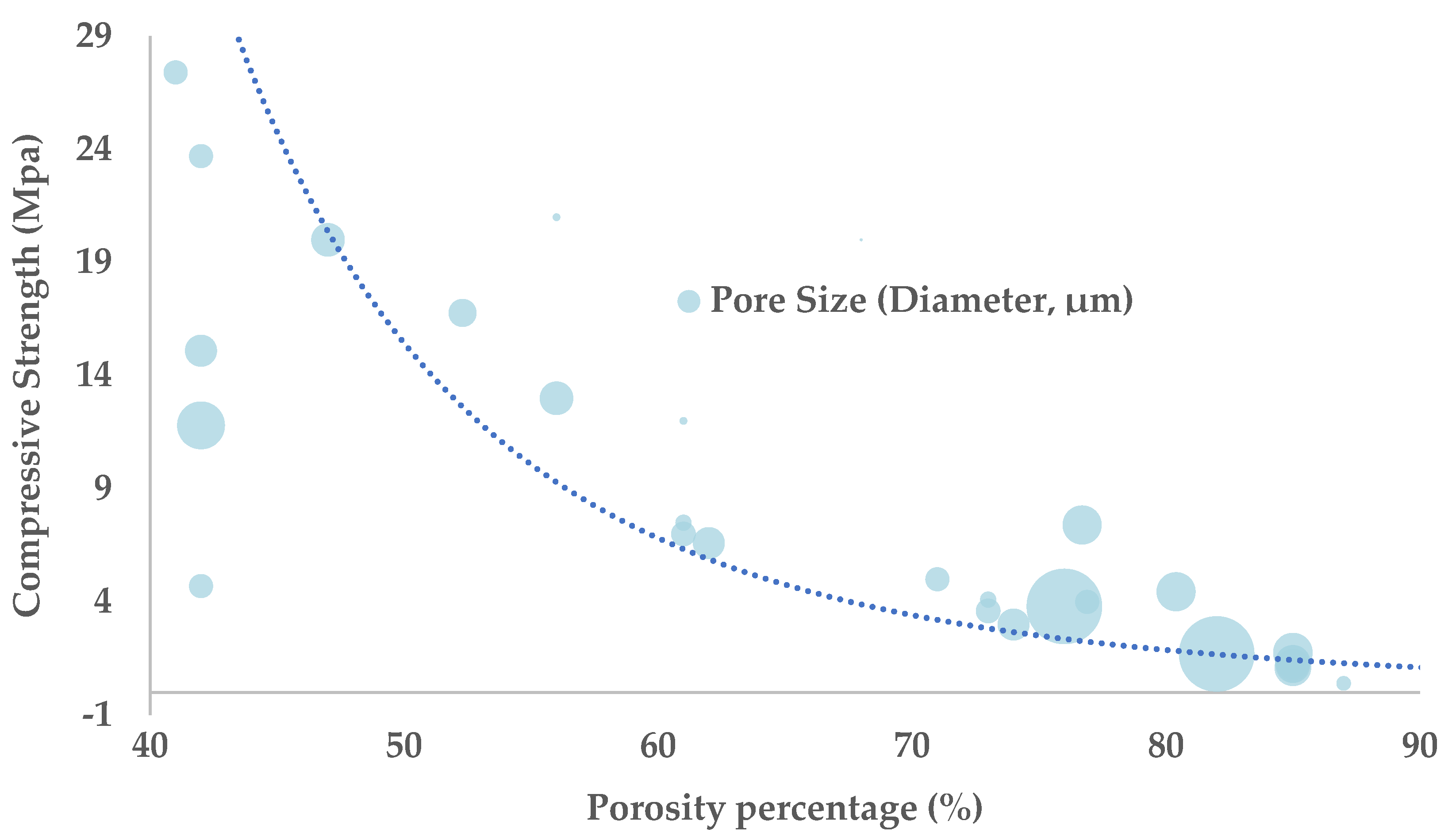 Material | Pore Size (Diameter μm) | Porosity (%) | Young’s Modulus (GPa) | Compressive Strength (MPa) | Reference |