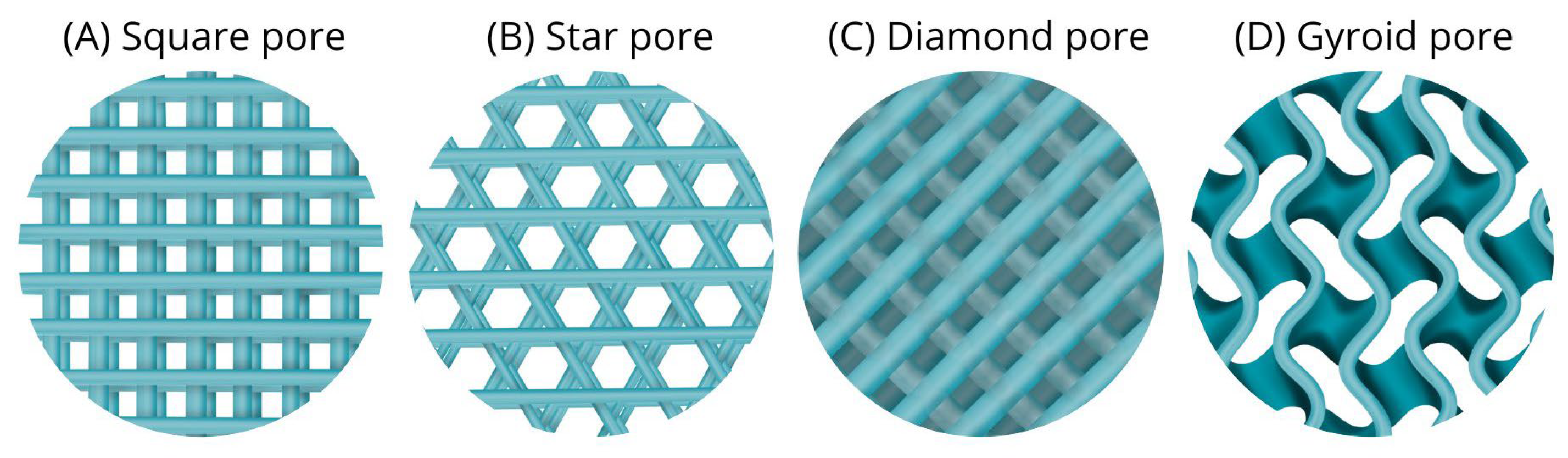 - Liu, Q.; Wei, F.; Coathup, M.; Shen, W.; Wu, D. Effect of Porosity and Pore Shape on the Mechanical and Biological Properties of Additively Manufactured Bone Scaffolds. Adv. Healthc. Mater. 2023, 12, 2301111. [Google Scholar] [CrossRef]