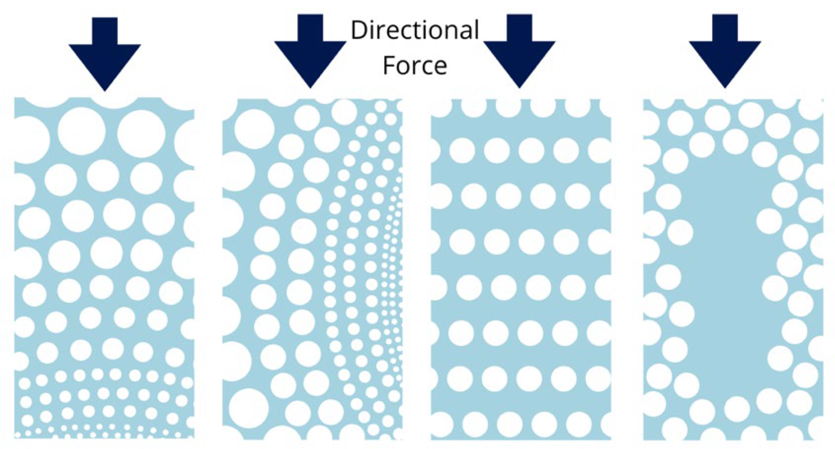 Applications | Bone scaffolds, filters, lightweight structures. Allows control of pore geometries, curvature levels and distribution. | Modeling of trabecular bone, soft tissues. Allows us to offer elaborated biomimetic micropatterns. |