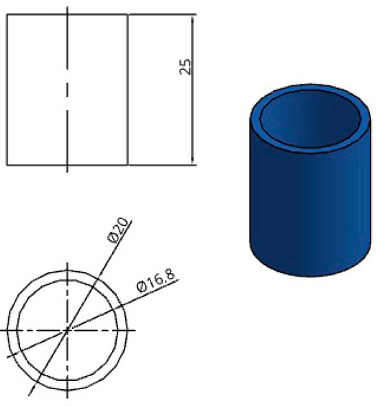 Figure 1. The component’s dimensions are 16.8 mm for the inner diameter, 20 mm for the outer diameter, and 25 mm for the height.