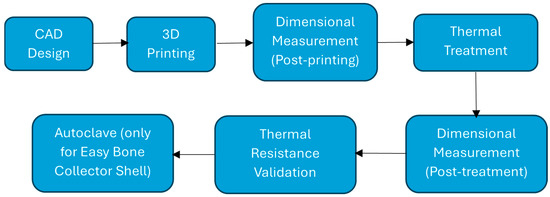 Dimensional outcomes are reported for the post-anneal state (Δ in mm; %Δ vs. CAD). The standard specimens (cylinder, bar, curved beam) were exposed to elevated temperatures in a dry oven (100–175 °C) to simulate the thermal load of sterilization, but we did not acquire caliper-based post-steam (134 °C) measurements for these samples. Steam autoclaving at 134 °C was performed only on the functional Easy Bone Collector (EBC) shell, for which we confirmed post-steam fit/function; quantitative post-steam metrology across samples is planned as follow-up work.