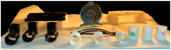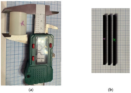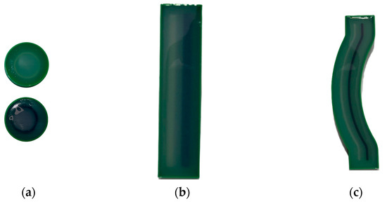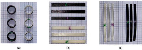 Figure 10 presents the three PLA specimen types after thermal post-processing and prior to heat resistance testing. Each set includes one untreated sample (unmarked), one sample annealed in RTV silicone resin (green “X”), and one annealed in salt (purple “X”). These three geometries were selected in order to evaluate the impact of shape complexity on annealing effectiveness: curved beams (c), rectangular bars (b), and cylindrical rings (a). All of the specimens at this point maintained their original geometry, making it possible to evaluate the deformation in future high-temperature exposures with clarity.