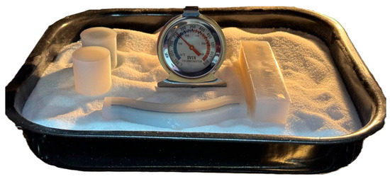 Figure 8, where the components were arranged on a heat-resistant tray that was filled with NaCl. The salt medium prevented deformation during heating and cooling, provided equal heat distribution, and provided stiff physical support. To keep an eye on and verify the internal temperature profile separately from the oven’s digital control, an external oven thermometer was positioned next to the components.
