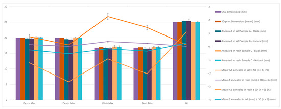 Figure 11 present the comparative dimensional data for Hollow Cylinder specimens in their CAD design, as-printed state, and after annealing in salt and resin. Six post-annealing samples are analyzed (A–F), covering both black and natural PLA Tough materials, under two distinct annealing media. Mean Δ, SD Δ, Mean %Δ and SD %Δ are graphically presented in the figure below and the values can be found for all samples and sample types in the