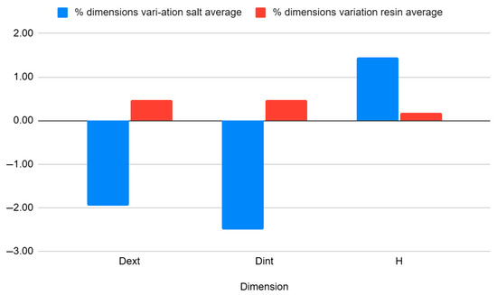 Figure 12 shows the average percentage variation in the dimensions of hollow cylinder specimens after heat treatment by annealing in salt and in resin. It can be observed that salt treatment resulted in a reduction of the outer diameter (−1.95%) and inner diameter (−2.50%), while the height increased slightly (+1.46%). In contrast, resin treatment had a much smaller effect on the dimensions, with positive variations of approximately 0.47% for the diameters and 0.18% for the height, indicating better dimensional stability.