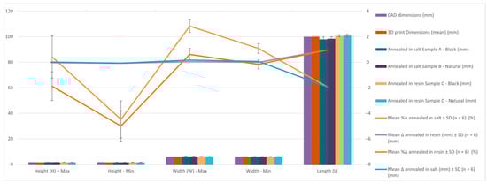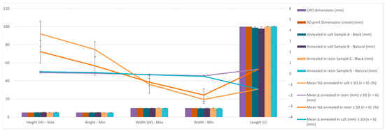 Specimens annealed in resin, on the other hand, showed more balanced height and width profiles and retained CAD-aligned dimensions (e.g., L = 100.25–100.4 mm).