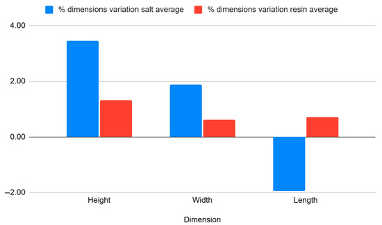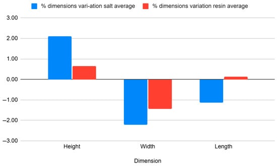 Figure 14 show the average percentage variation in the dimensions of rectangular bar specimens after heat treatment by annealing in salt and in resin. It can be observed that salt treatment resulted in an increase in height (+2.10%) and a reduction in width (−2.22%) and length (−1.14%). In contrast, resin treatment caused smaller dimensional changes, with a slight increase in height (+0.64%), and decreases in width (−1.43%) and length (−0.12%), indicating better dimensional stability compared to salt treatment.