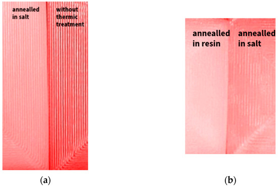 Figure 16 show the average percentage variation in the dimensions of curved beam specimens after heat treatment by annealing in salt and in resin. It can be observed that salt treatment resulted in a significant increase in height (+3.53%) and width (+1.88%), while the length decreased (−2.01%). In contrast, resin treatment produced smaller dimensional changes, with increases in height (+1.36%), width (+0.63%), and length (+0.63%), indicating better overall dimensional stability compared to salt treatment.