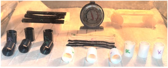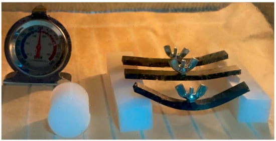 Figure 19 shows the complete collection of printed PLA geometries arranged for thermal exposure at 150 °C. Each geometry—rectangular bars, curved beams, and hollow cylinders—was represented by multiple specimens with different thermal treatments: untreated, annealed in salt, and annealed in RTV resin (marked accordingly). This setup allowed simultaneous observation of deformation thresholds under identical conditions. The thermometer positioned centrally validates the internal oven temperature during testing, ensuring accurate assessment of thermal behavior across treatments and geometries.