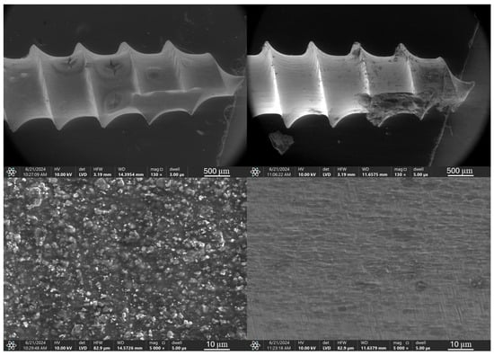 Microscopic images of the coated micro-implants illustrating the comparative analysis of the coating condition before and after simulated ex vivo tests are shown in Figure 3, Figure 4, Figure 5 and Figure 6. The TAD micro-implant coated with a TiNP layer prior to the ex vivo simulation (Figure 3, left) exhibits a homogeneous coating with small, uncovered areas, primarily observed at the thread edges and the tip of the implant head. The absence of a coating on the head of the micro-implant is due to the fact that only the threaded part comes into direct contact with the bone, and the coating was applied exclusively to this section. In contrast, the analysis of the TAD implant after the ex vivo simulation (Figure 3, right) indicates that the adhesion of the coatings was insufficient to withstand the increased mechanical forces associated with implant placement in the rib bones. Only residual fragments of the damaged layer are visible on the implant threads.